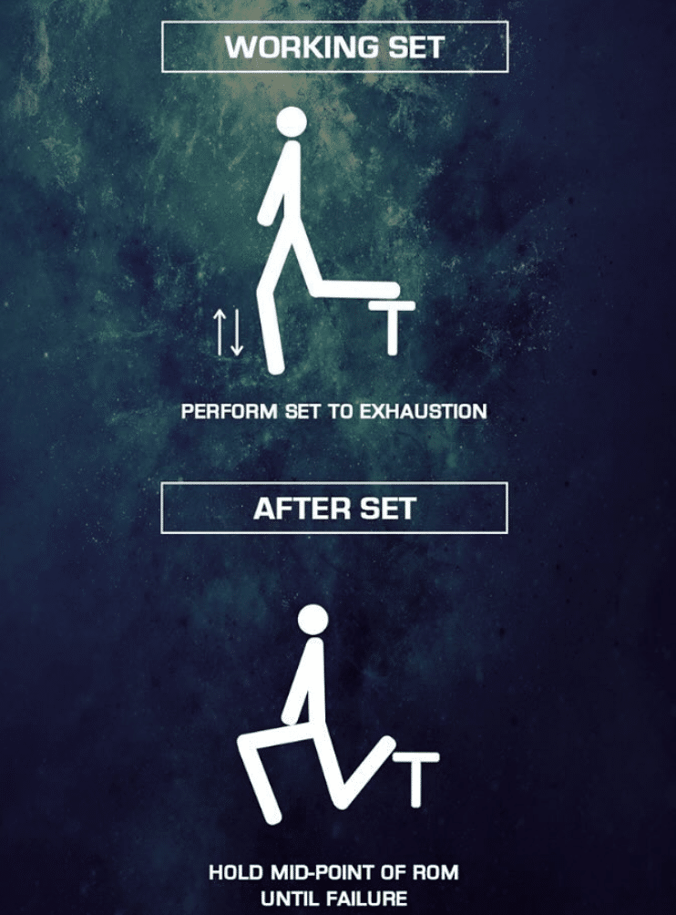 An Isohold is a variation of static hold that is meant to maintain a position against a sub-maximal load and with sub-maximal contraction strength, thus differentiating it from an Isometric or EQI. As an intensity technique, Isoholds are performed after an initial set to, or close to, failure where the hold should be maintained in a position of relative, mechanical strength. The additional tension generated is beyond what would be theoretically achievable with just a straight set to failure.
